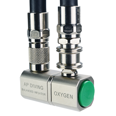 Die untere schwenkbare Einlass dreht sich mit, um eine Schlauchführung aus jeder Richtung zu ermöglichen, so dass eine unabhängige Sauerstoffversorgung von Onboard-, Sidemount- oder Buddy-Flaschen an denselben Inflator angeschlossen werden kann.