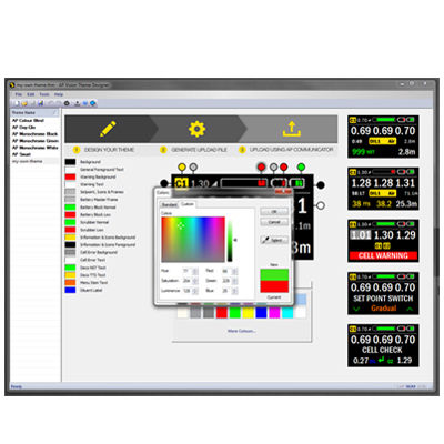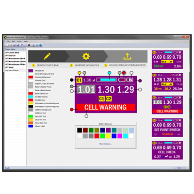 Custom Theme Designer-Software ist in der Standardausstattung enthalten. Damit kann der Taucher individuelle Modi und Schemata nach eigenem Belieben, persönlichem Farbempfinden oder Tauchbedingungen gestalten. Aus Sicherheitserwägungen gibt es voreingestellte Grenzen dieser Einstellungsmöglichkeiten, um Einstellungen mit zu geringem Kontrast/Sichtbarkeit zu verhindern. Darüber hinaus aber gibt es reichlich Raum zum Ausprobieren, Hochladen und Speichern von bis zu zwei personalisierten Einstellungen für die Startauswahl.
