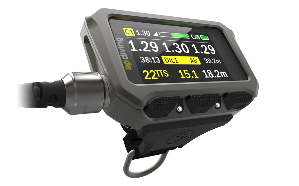 Formvollendet in ihrem schlichten Design – die 3 federgelagerten Schalter betreiben magnetisch die internen Reedschalter und sind mechanisch getrennt/entfernt vom Inneren des Handsets und reagieren nicht auf Wasserdruck. Die 3-Knopf-Anordnung und Arbeitsweise ist eingängig und vertraut und erlaubt eine intuitive Bedienung für bisherige AP Rebreathertaucher.