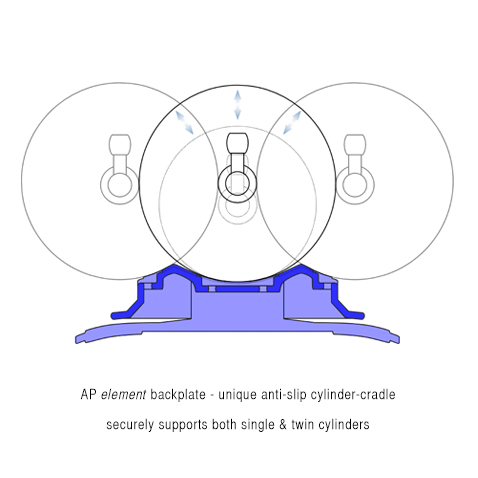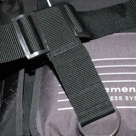 Wir haben dem Gurtband genug Länge gegeben, um auch für ungewöhnliche Flaschengrößen vorzusorgen, so dass Sie nicht das Problem zu kurzer Gurte bekommen sollten. Wenn die Doppelflaschen mit Abstandhalter montiert sind, kann entweder eine Ventilbrücke oder individuelle Atemregler benutzt werden. So oder so, die Flaschen werden ebenso sicher und fest gehalten wie von einer Metallbebänderung und es ist nicht erforderlich eine Doppelflaschen-Schiene anzubringen. Wieder auf Monoflasche umzustellen erfordert ebenfalls keinerlei Werkzeug und dauert nur ein paar Minuten.