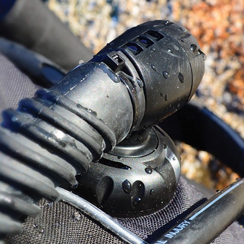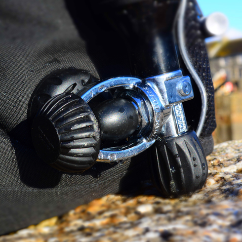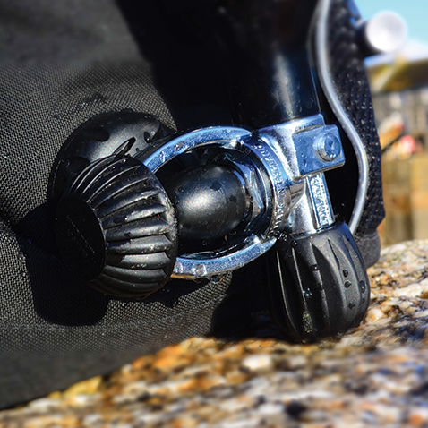Ein dritter standardmäßiger Schlauchschnellablass ist am Inflatorgelenk integriert und gewährleistet damit eine einhändige Tarierkontrolle, indem das Jacket mit einer Hand aufgeblasen und die Luft abgelassen werden kann, während man mit der anderen vielleicht an einem Stein oder Wrack Halt sucht.