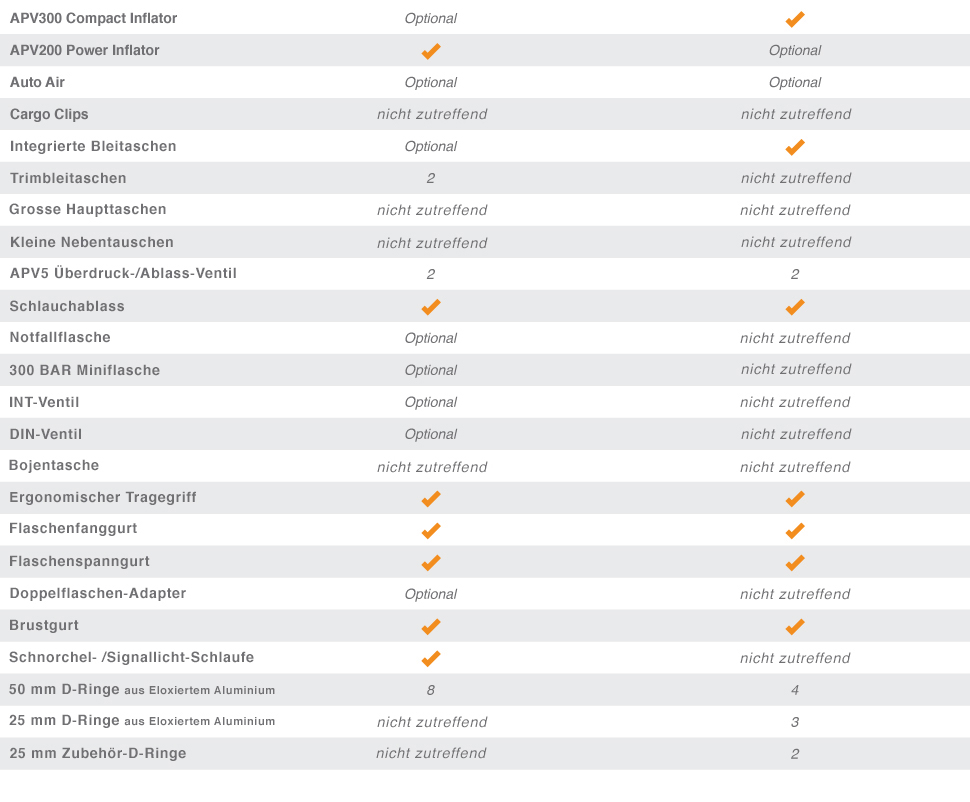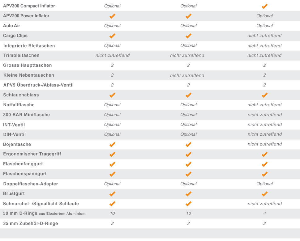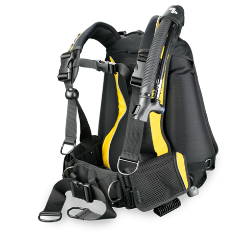 Tarierkontrolle und Komfort werden noch aufgewertet mit 3 hochansprechenden Ablass-/Überdruckventilen, einer Auswahl an Notfall-Atemventilen/Inflatoren und einem optionalen integrierten Gewichtssystem.