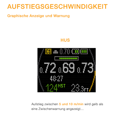 - Die Kurve wird rot, um vor zu schnellem Aufstieg zu warnen und die normale Textwarnung wird angezeigt