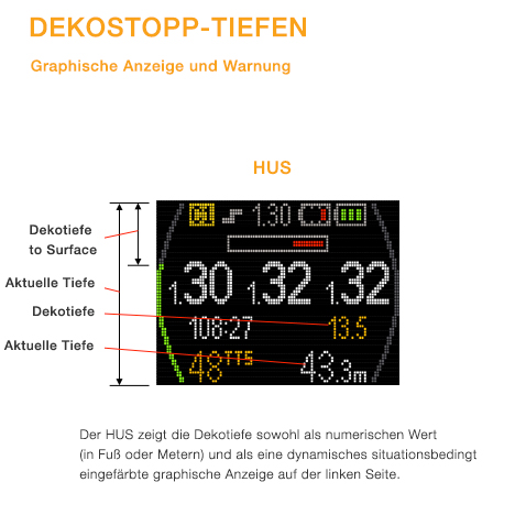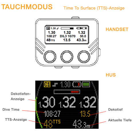 - Sobald Dekopflicht eintritt, werden Informations-Signale/Alarme wie z.B. Time to Surface (TTS) und Dekotiefe in Gelb angezeigt