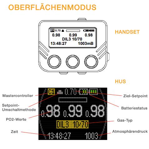 Das Farbdisplay übermittelt alle wichtigen Informationen zum Rebreatherstatus mit dem Zusatznutzen situationsbedingter Farbgebung, um den aktuellen Status der bereitgestellten Daten und Informationen noch hervorzuheben.
