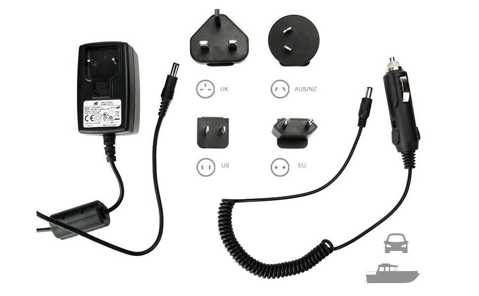 Das Batterie-Paket kann vom normalen Stromnetz (100-240 V) oder 12 V DC Stromversorgungen aufgeladen werden. Das Set enthält einen vollen Satz internationaler Netzadapter (Typen A, C, G & I) und einen 12 V DC Stromadapter – für den Gebrauch mit passenden DC Stromanschlüssen im Auto oder auf dem Boot – und erlaubt ein Aufladen wo auch immer auf der Welt Sie tauchen.