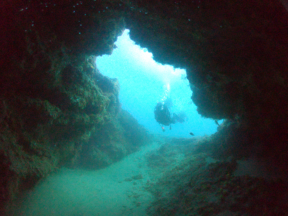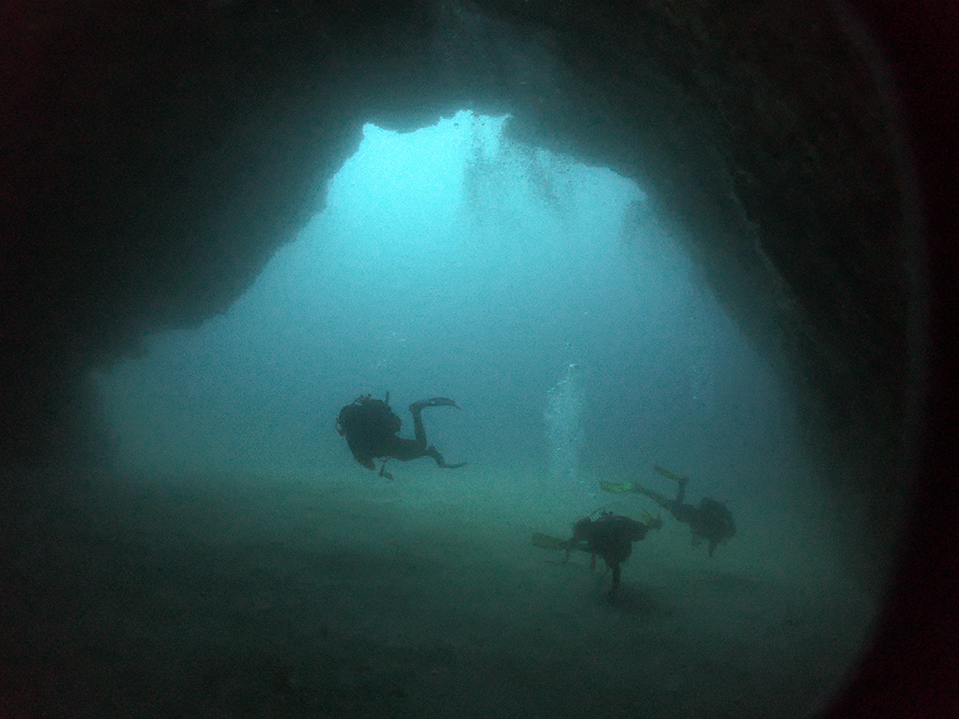 Swimming southwest this time from the harbour we eventually came to the entrance, an initially uninspiring hole in the ground, which opened up into an impressive cave with a slight dogleg to the south to daylight beyond.