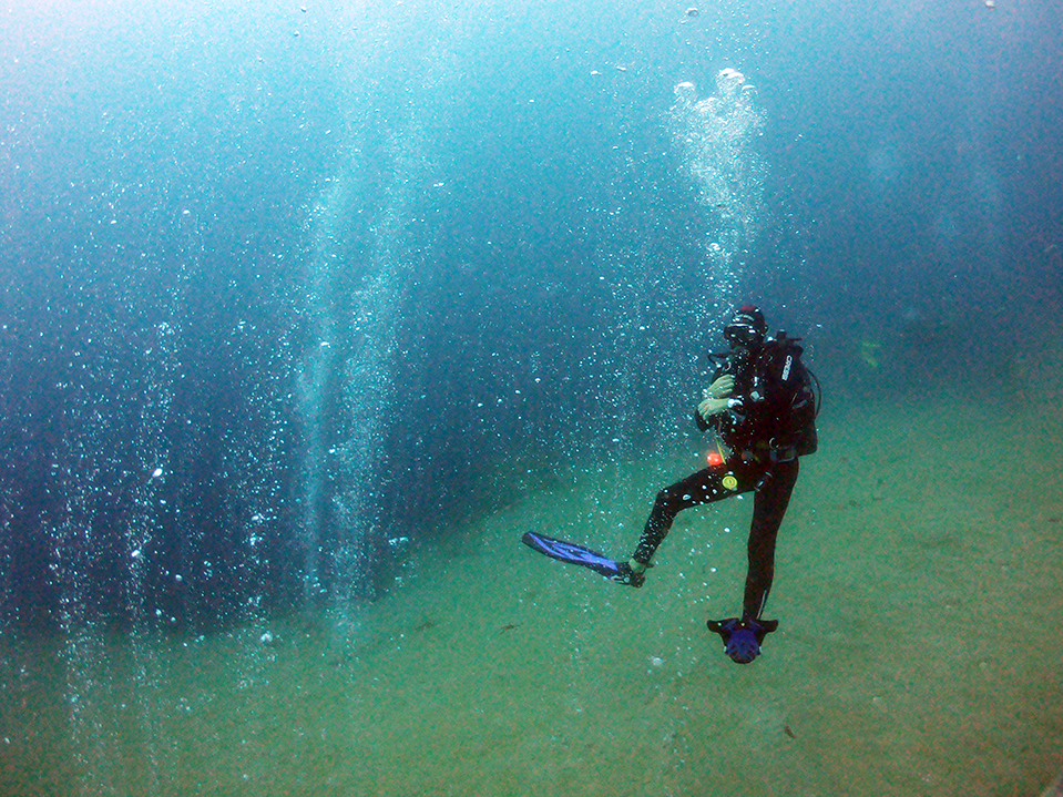DCIM100GOPROGOPR0339.JPGOn the sandy plateau directly above The Cathedral we came across a forest of air streams bubbling out of the sand like volcanic activity. It is caused by the exhausts of the many visiting divers filtering up through the rocks and sand. Just like us, the Cathedral is off-gassing.