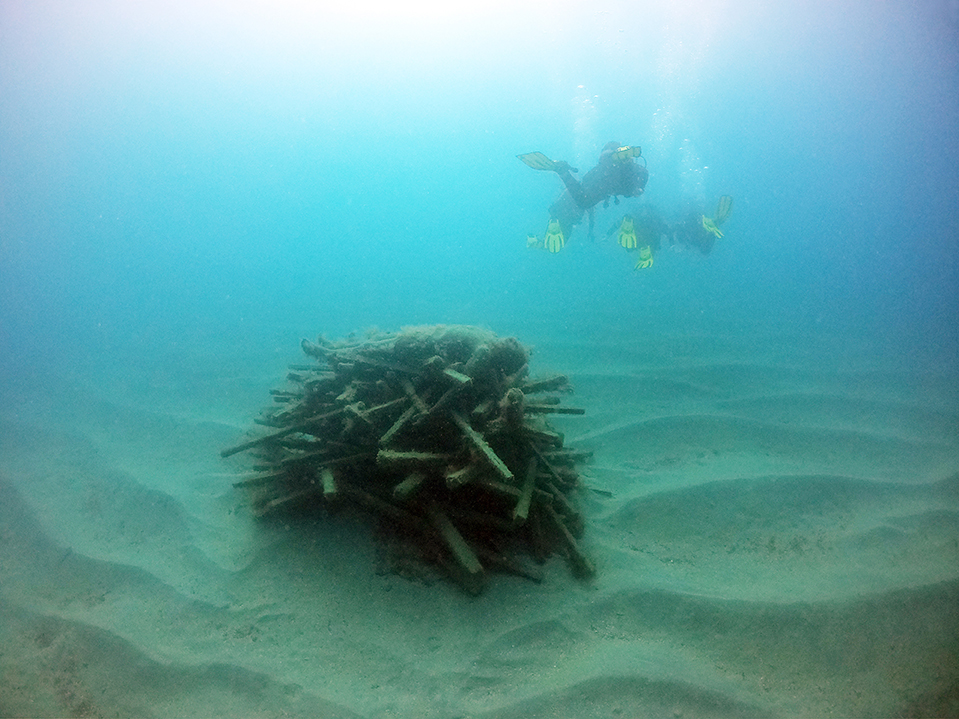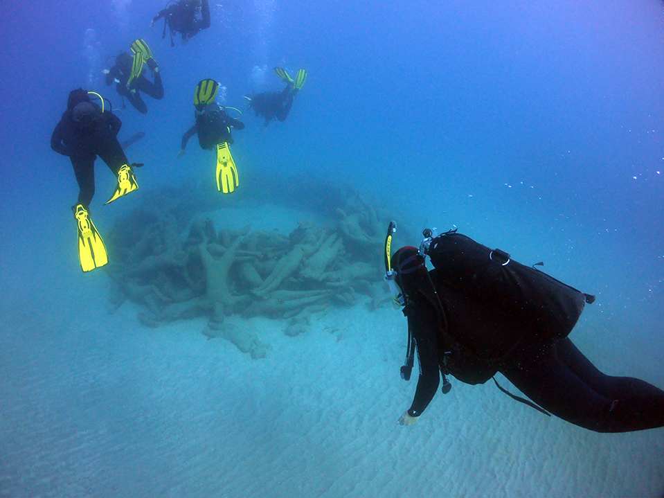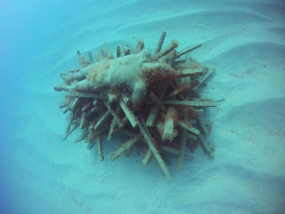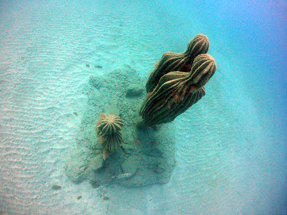 The Museum site loomed after a 10-15 minute ride and the RHIB moored up alongside a hardboat with Museo Atlántico printed on the side. We sat, bobbed about and sweated into our wetsuits (25 degrees, mid-day on the hottest day of the week) for what seemed like an age, waiting for the previous boatload of divers to exit the area. While we waited I stared at the huge yellow buoys that mark out the 2,500 square metre site, presumably as a no-go zone for other boats.