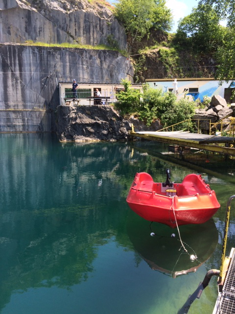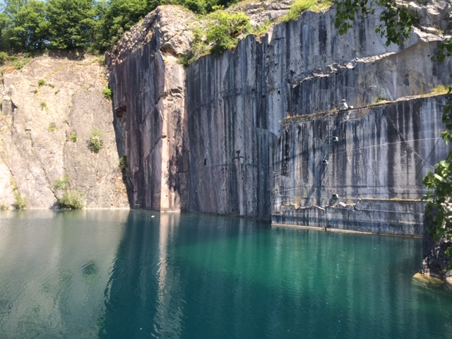 The gray and red marble that was mined here is called Royal, Imperial and Griotte. The walls of the quarry are therefore beautiful in color. Under water you can still find beautiful pieces of marble.