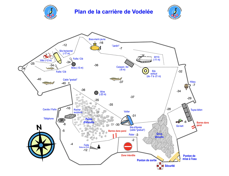 You can go into the water along a small road that runs up to the surface of the water or from a platform 3 meters above the surface of the water (ideal for showing off your giant stride jump). Below the platform there is a depth between 3 and 6 m. The steep walls of the quarry fall perpendicular to 30 m, with ridges at different depths. On the left-hand side of the quarry, the wall drops to 30 m, sloping and is littered with boulders.