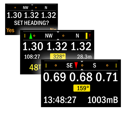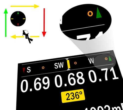 If the diver’s direction of travel is off the heading – for example, if you are following one of the 90° yellow bars, as you would on the second or fourth leg of a square navigation pattern – smaller green and red arrows appear at either end of the display to orientate yourself against the original heading and the reciprocal direction.