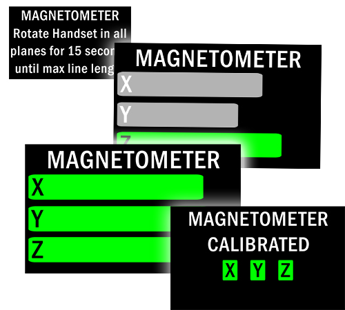 Compass calibration is straight-forward involving 2 elements: an accelerometer (annual calibration) and a magnetometer (routine). Both calibrations involve a simple handset rotation process with clear graphical indications of success in each of the 3-dimensional (x,y,z) planes.