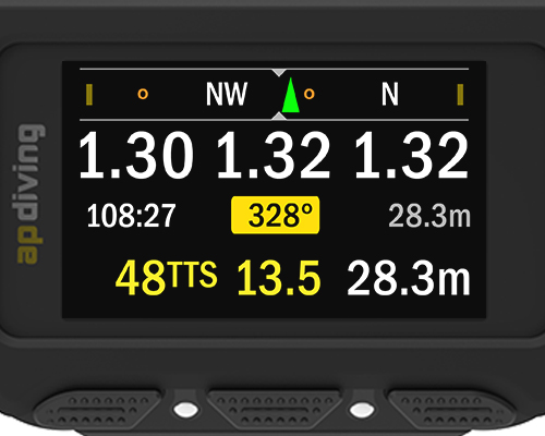 Supremely accurate and easy-to-read, the three axis, tilt compensated, digital compass is clearly displayed across the top of the 2020VISION screen. The compass can be switched on/off during the dive or temporarily taken off-screen to check on the rebreather info normally displayed in that area. If a status warning occurs the compass display alternates with the warning display.