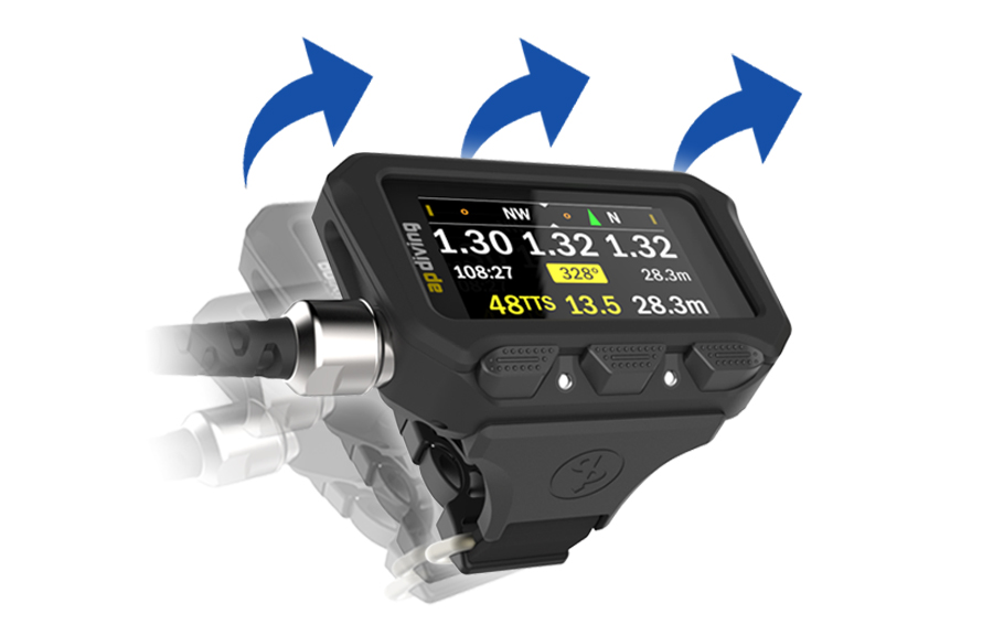 If the power-saving Auto-Dimming function is selected, the display backlight dims automatically after 5 seconds. The new Tilt Activation option allows a quick restoration of full brightness by simply rotating (or swinging) the handset towards you. Appropriate movement through all 3 axes effectively detects when the diver wants to look at the display and will trigger the backlight.