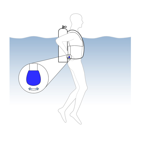 - Option Mini-bouteille d'Urgence – Une bouteille 232b étrier ou 300b DIN, offrant une option de respiration d'urgence en utilisant les équipements de respiration d'urgence décrit ci-dessus, ou offrant une solution de flottabilité d'urgence pour rejoindre la surface.