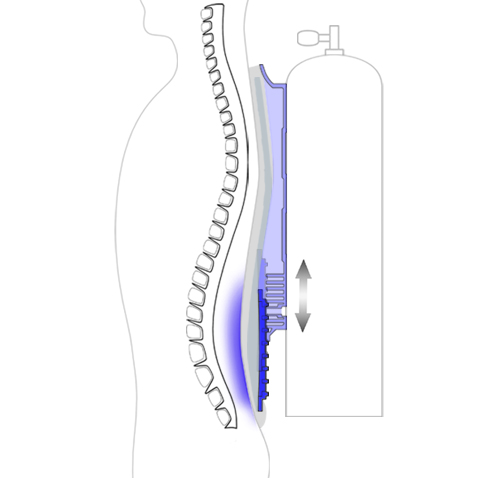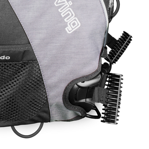 Le système Breveté AP de fixation par goujons, protège non seulement l'enveloppe assurant la flottabilité en transférant les contraintes sur la structure externe, mais il permet une circulation rapide du flux d'air dans cette enveloppe. Ceci empêche la formation de poches d'air coincées dans certaines parties du gilet et permet aussi au plongeur de bouger plus librement sous l'eau.