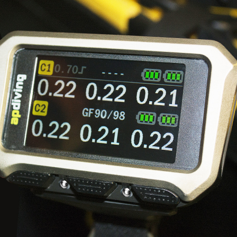 - Informations sur l'état du Recycleur dans le champ de vision tout au long de la plongée