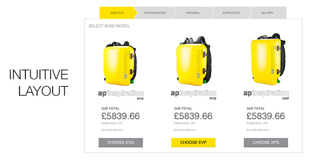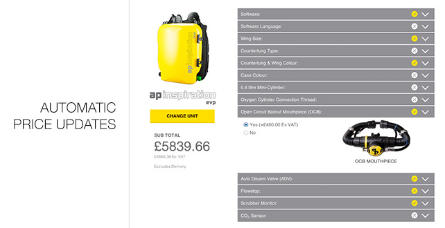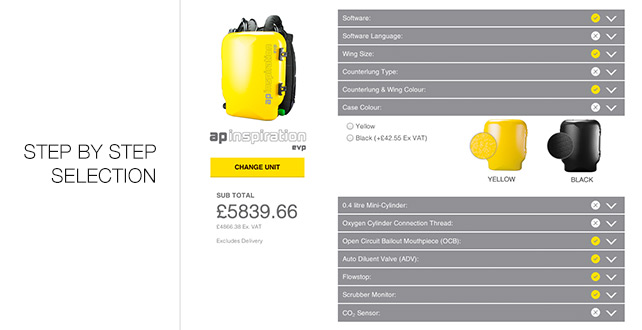 Today we’re proud to be launching the AP Rebreather Configurator. The AP Configurator allows you to step through the choices available when considering a new Inspiration, to preview the costs involved and produce a provisional wish-list of your configured unit to send to us.