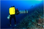 Nos plongées se sont déroulées en courant rentrant, à partir de la bordure extérieure de la passe pour ensuite nous laisser dériver à l’intérieur. Aidés de nos propulseurs SUEX ADV XJoy14, nous avons pu traverser d’un bord à l’autre ce spot magnifique pour y découvrir les immenses bancs de requins gris (Carcharhinus amblyrhynchos), de perches à bordures jaunes (Lutjanus fulvus), des perches pagaie (Lutjanus gibbus), des perches à raies bleues (Lutjanus kasmira) et de fusiliers tricolore (Pterocaesio tile). Silencieux et discrets, nous nagions littéralement dans les bancs de ces poissons.